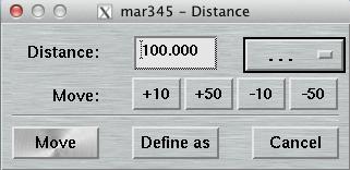 The "Move Distance"-window can be accessed by selecting the corresponding choice in the "Windows"-menu or by pressing the "F8"-key while the pointer is in the main window or by pressing any of the distance status button in the status area. The window does not show up, if the mar345 program is configured to work without base (IGNORE BASE).