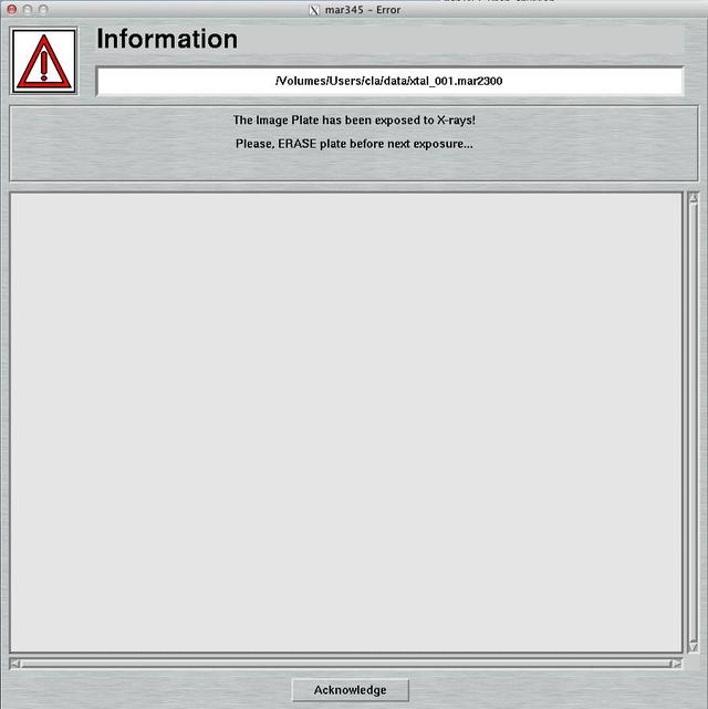 At startup, the program writes information about connection success or failure into file $MARLOGDIR/mar.message. This message is read and displayed by program marstart which is called automatically by program mar345. If the program cannot connect to the detector, the program mar345 will be halted. Program marstart then offers a choice of either killing process mar345 or continuing with program mar345 without network connection.