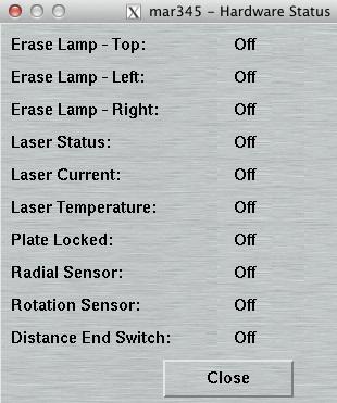 Here, you can look at certain hardware bits in detail. The information presented here reflects the contents of the status block that is periodically sent by the mar345-controller to the computer. The entries should be self-explanatory. Watch the bits as they change state during a scan...