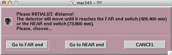 The "Initialize"-window can be accessed by selecting the corresponding button in the main window. Here, you initialize the motor for the distance translation stage of the standard mar goniostat (see also chapter "Move Distance"). You may initialize the motor either at the far end (away from the sample) or at the near end (close to the sample). It should be noted that it is definitely safer to initialize the motor at the far end of the translation stage in order to avoid collisions with the goniometer head and/or or cryo-head.