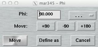 The "Move Phi"-window can be accessed by selecting the corresponding choice in the "Windows"-menu or by pressing the "F9"-key while the pointer is in the main window or by pressing any of the PHI status button in the status area. The window does not show up, if the mar345 program is configured to work without base (IGNORE BASE).