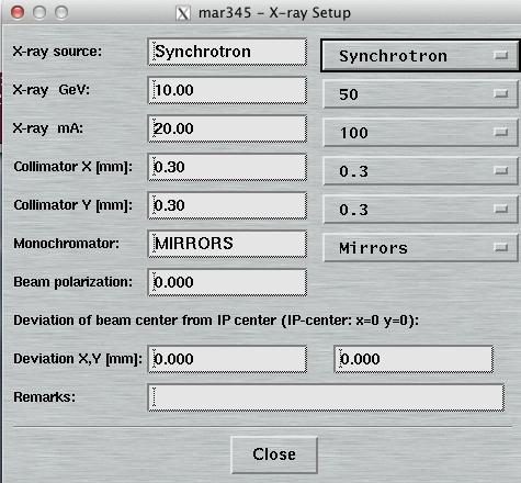 Here, you can provide some information that is going to end up in the headers of images created by the mar345-detector. This information is strictly optional and there are no programs that are systematically making use of it. It would be good practice, though, to fill in the fields. A general experience is, that when working with images later you will have trouble to find notes written in a logbook, but it is straightforward to just look into the image header (e.g. with program catmar).
