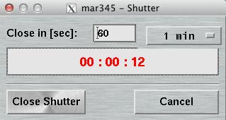 Here, you may manually open the experimental beam shutter of the dtb without having to setup an exposure. It should be noted that for normal users there is little need to do so. When opening the shutter, there will be a clock showing the time elapsed since opening the shutter. The shutter will automatically closed after the time given in the "Close in [sec]" text field has elapsed .