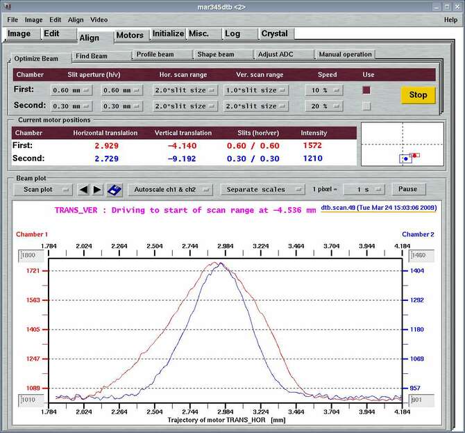The parameters for beam optimization depend on the nature of the X-ray beam, i.e. the type of optics used. As a rule of thumb, for optimizing the first chamber, the slits should be opened to an aperture that corresponds approximately to the beam size at this point. Typical values for Osmic mirrors are 0.7 to 0.6 mm. After refining the first chamber, the slits in the first chamber will be closed down, typically to 0.3 to 0.4 mm and the second chamber should be refined also with small slit apertures. The variable parameters for this procedure are the following: