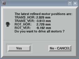 This window allows to drive directly all translational and rotational motors to the most recent refined positions. A motor position will be treated as refined if it has gone either through the "Find beam" or "Optimize beam" procedure. This option is very useful if for some reason the motors have been moved manually, or if for instance beam optimization has been started without X-rays.