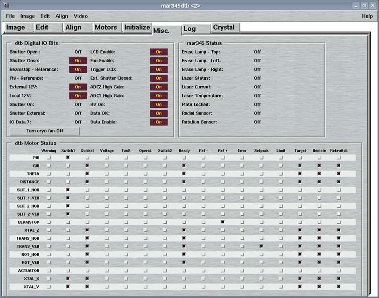 This area looks at some information from the mar345 image plate detector. The entries should be self-explanatory. Watch the bits as they change state during a scan... - dtb Motor Status: