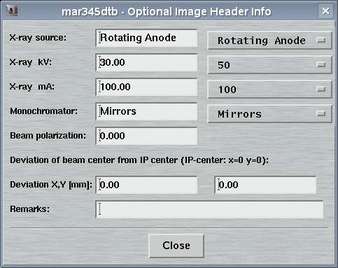 Here, you can provide some information that is going to end up in the headers of images created by the mar345-detector. This information is strictly optional and there are no programs that are systematically making use of it. It would be good practice, though, to fill in the fields. A general experience is, that when working with images later you will have trouble to find notes written in a logbook, but it is straightforward to just look into the image header (e.g. with program catmar).