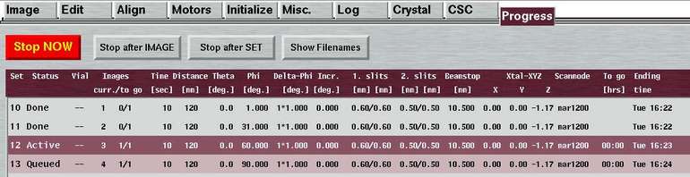 Here, you see the most important parameters of ongoing or programmed data collection runs. The window is opened automatically after pressing the "Go" button in the "Edit Data Collection"-window and before actually starting with a data collection. Since there is quite a large number of parameters that need to be listed, the window comes in 2 layouts that can be toggled on the fly by pressing the "Show Filenames"-button (which then says "Show Params""). On the first page ('Params'), you can see the crystallographic parameters, on the second page ('Filenames') the image file names and some additional options.
